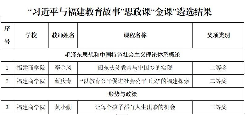 根据《中共福建省教育工委关于公布“习近平与福建教育故事”思政课“金课”遴选结果 暨教学展示活动的通知》(闽委教思〔2023〕14 号)文件精神,我院喜获二等奖2项,三等奖1项,具体如下: