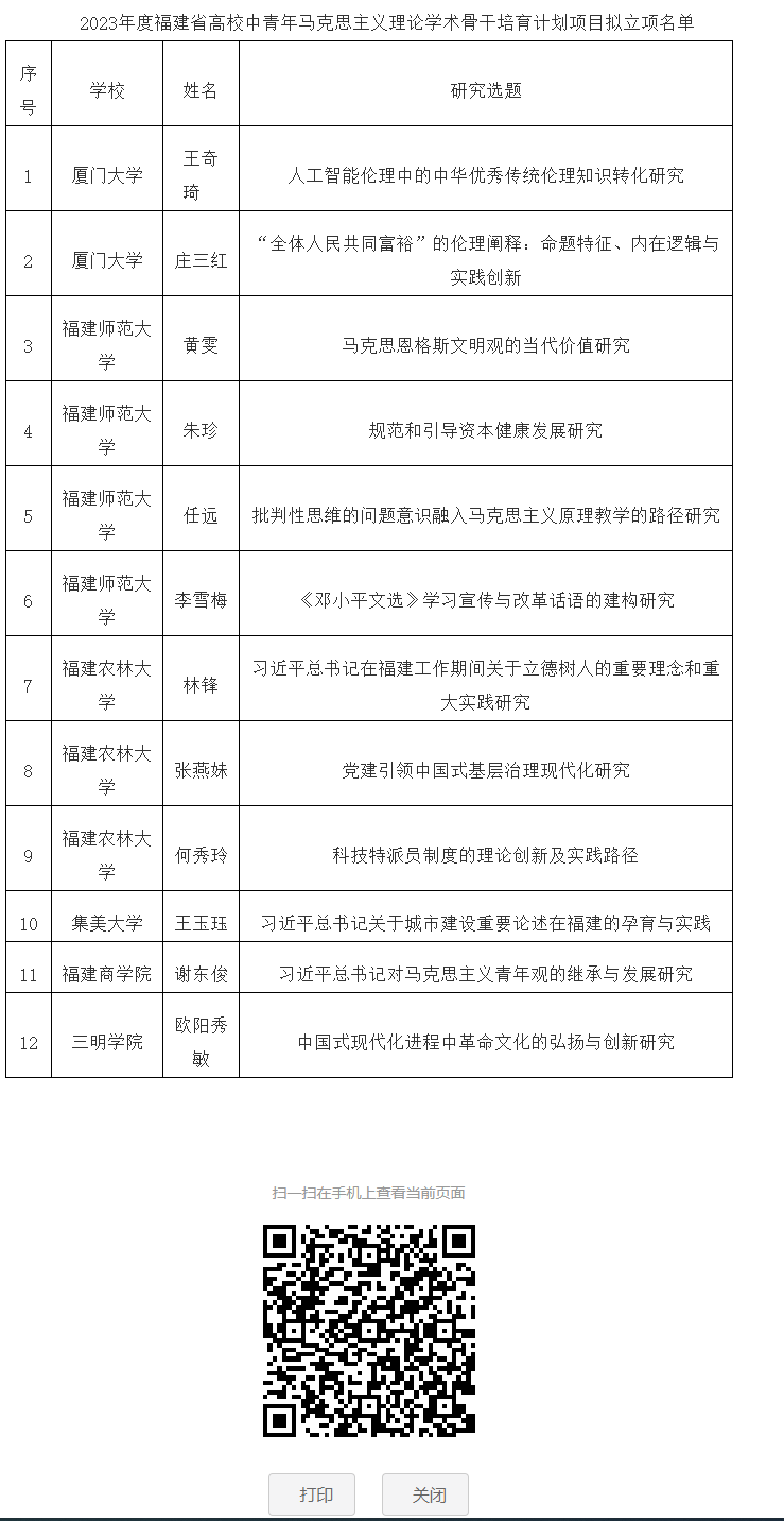 喜讯: 根据《中共福建省委宣传部、中共福建省委教育工委、福建省社会科学界联合会关于实施2023年度福建省高校中青年马克思主义理论学术骨干培育计划项目申报工作的通知》(闽委教思〔2023〕19号)要求,经有关高校推荐、专家评审,拟立项厦门大学王奇琦的“人工智能伦理中的中华优秀传统伦理知识转化研究”等12项高校中青年马克思主义理论学术骨干培育计划项目,我院谢东俊老师习近平总书记对马克思主义青年观的继承与发展研究获得立项。