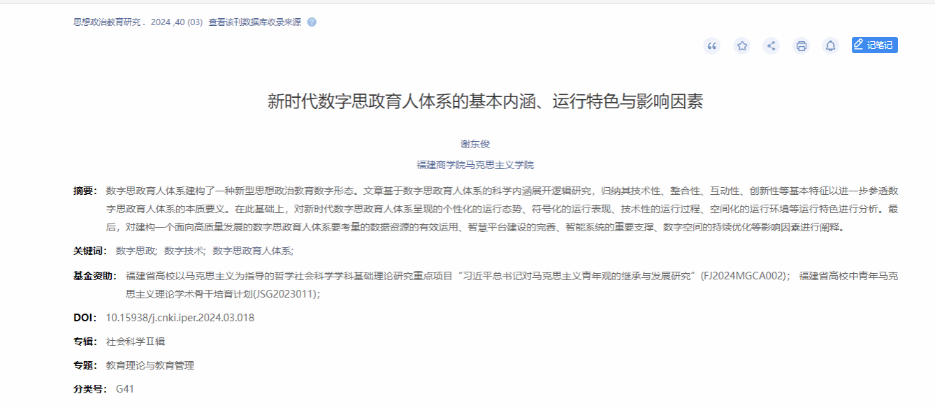 近日,我院谢东俊副院长在北大核心期刊《思想政治教育研究》发表文章《新时代数字思政育人体系的基本内涵、运行特色与影响因素》