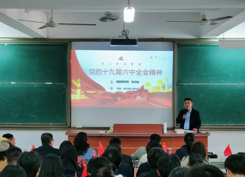 12月7日下午,校党委副书记吴访益在连江校区诚信楼中阶4教室开展了题为“深入学习贯彻十九届六中全会精神暨学习福建省第十一次党代会精神”的思政课,校相关处室负责人、yl6776永利集团全体教职工、校习近平新时代中国特色社会主义思想读书社全体成员共120多人参与了此次宣讲。