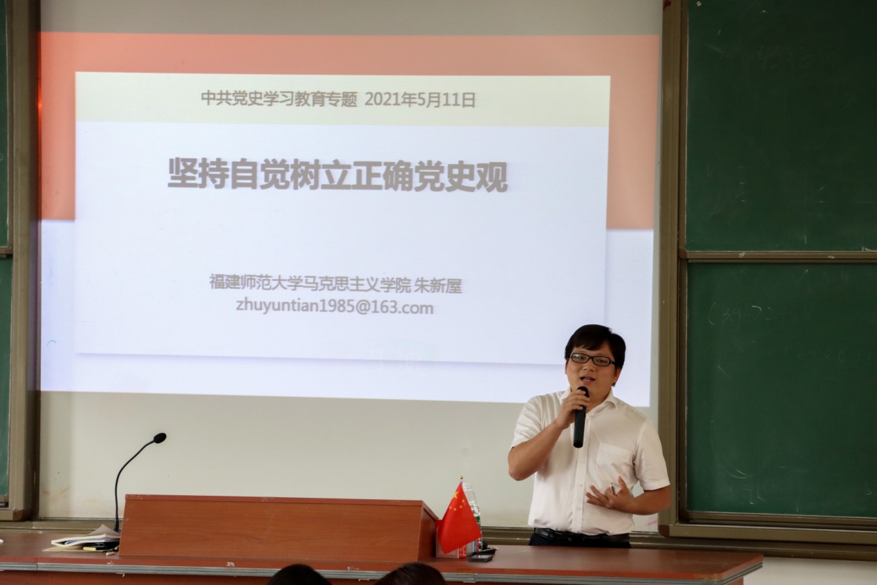 5月11日下午,马克思主义理论大讲堂邀请党史学习教育省委宣讲团成员朱新屋老师到我校作题为“坚持自觉树立正确党史观”的专题讲座。yl6776永利集团全体教师、大讲堂成员,统战部、规划处、国资处支部党员到场听取报告。