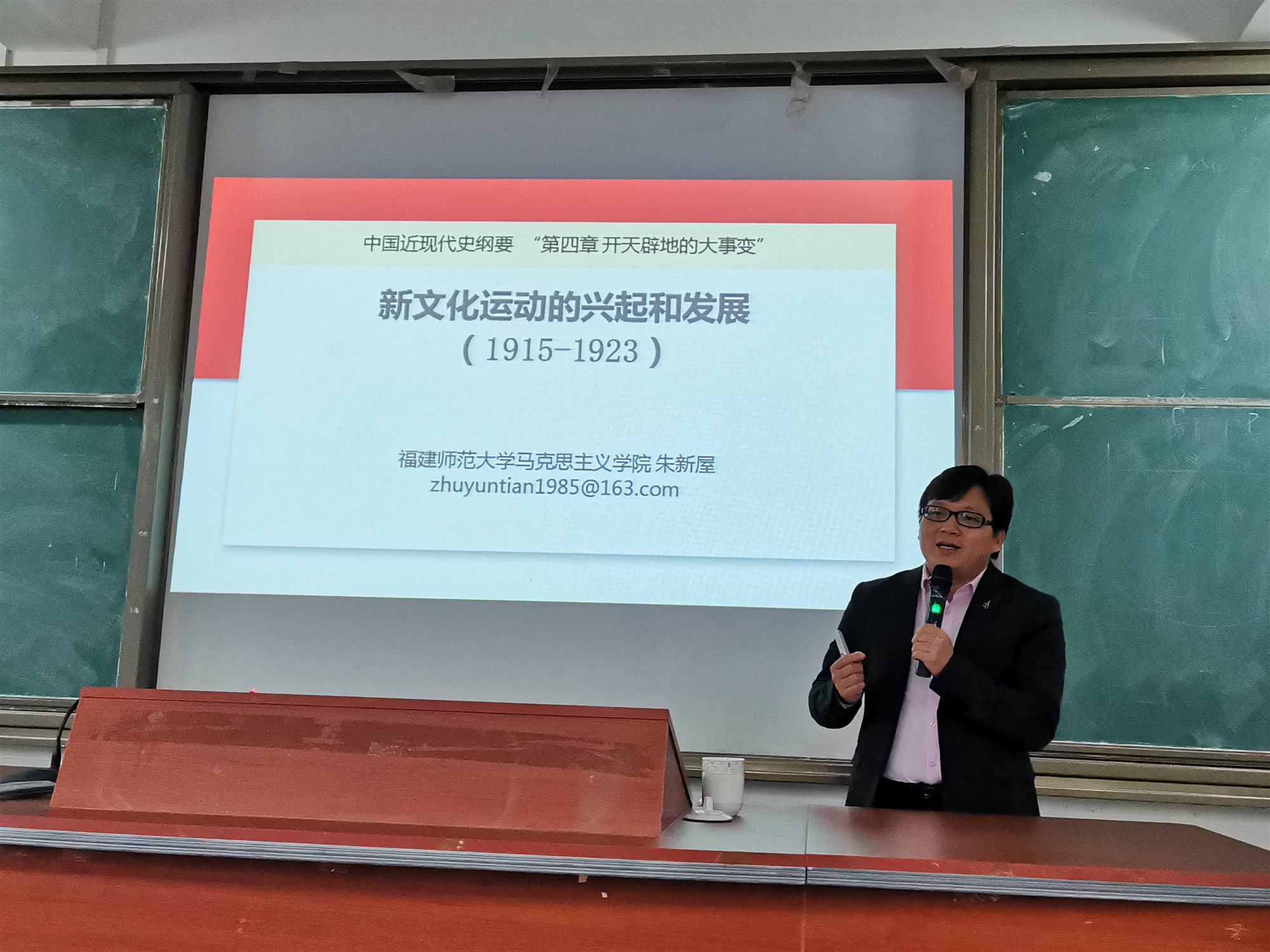2020年12月14日,福建省高校青年教学名师福建师范大学朱新屋副教授应邀到我校作题为”新文化运动的兴起和发展(1915—1923)”的示范教学。yl6776永利集团部分教师以及2020级数据科学与大数据技术1、2班学生参加学习。