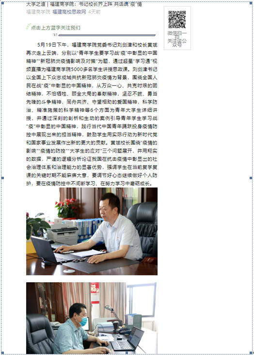 2020年5月23日,福建高校思政网以《大学之道 yl6776永利集团书记校长齐上阵 共话战“疫”情》为题,报道我校书记校长分别以“青年学生要学习战‘疫’中彰显的中国精神”“新冠肺炎疫情影响及对策”为题,通过超星“学习通”视频直播为我校5000多名学生讲授思政课的特色做法。