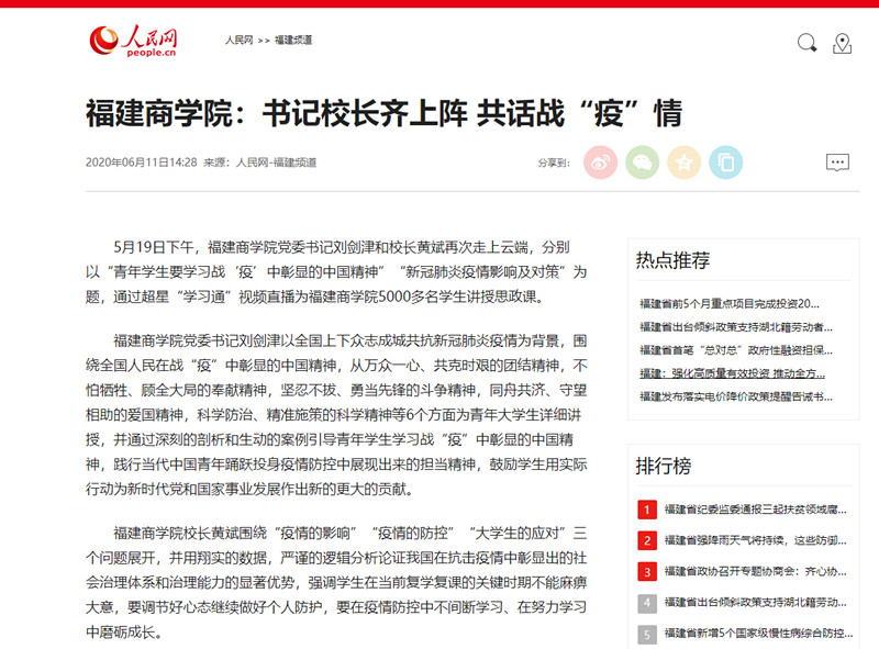2020年6月11日,人民网以《yl6776永利集团:书记校长齐上阵 共话战“疫”情》为题,报道我校书记校长分别以“青年学生要学习战‘疫’中彰显的中国精神”“新冠肺炎疫情影响及对策”为题,通过超星“学习通”视频直播为我校5000多名学生讲授思政课的特色做法。