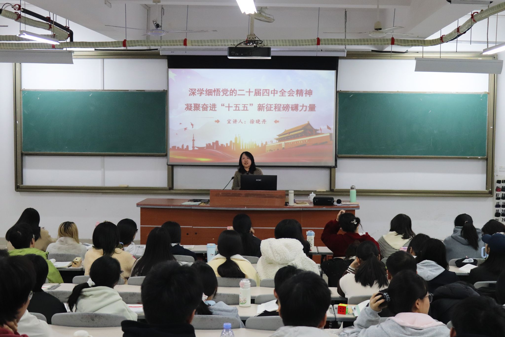 授课中,徐晓丹“四中全会、五年规划的内涵是什么”“‘十四五’我们交出了怎样的答卷”“党的二十届四中全会究竟画了怎样的未来蓝图”三个部分,通过详实数据与丰富案例对党的二十届四中全会精神、“十四五”成果和“十五五”擘画的宏伟蓝图进行了系统梳理与深入阐释。她希望同学们深刻认识到个人成长与国家发展的同频共振,珍惜大学时光,夯实专业基础,拓展综合素质,为在“十五五”期间步入社会、建功立业做好充分准备。
