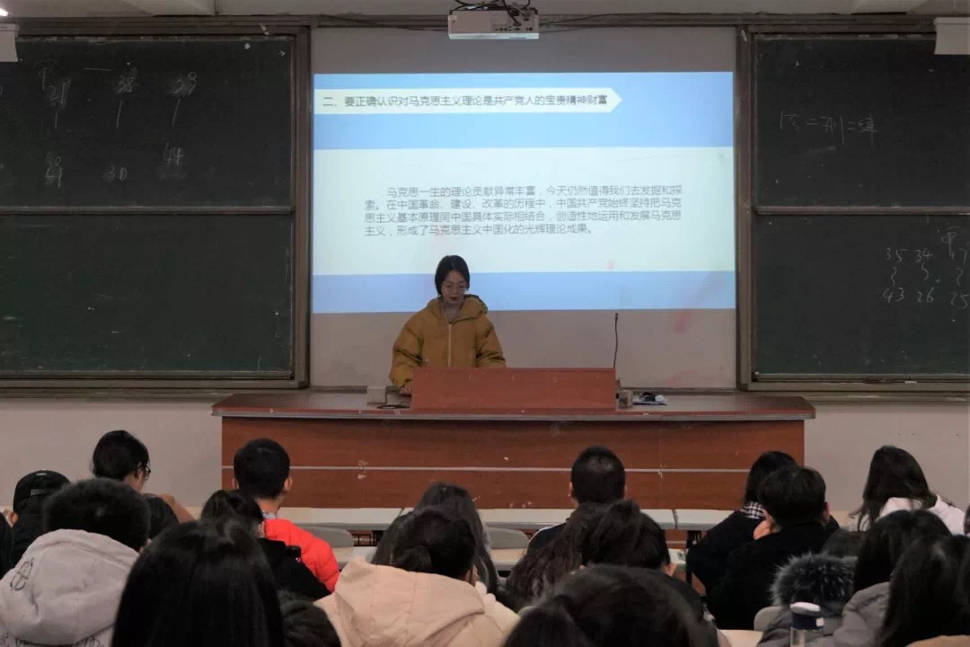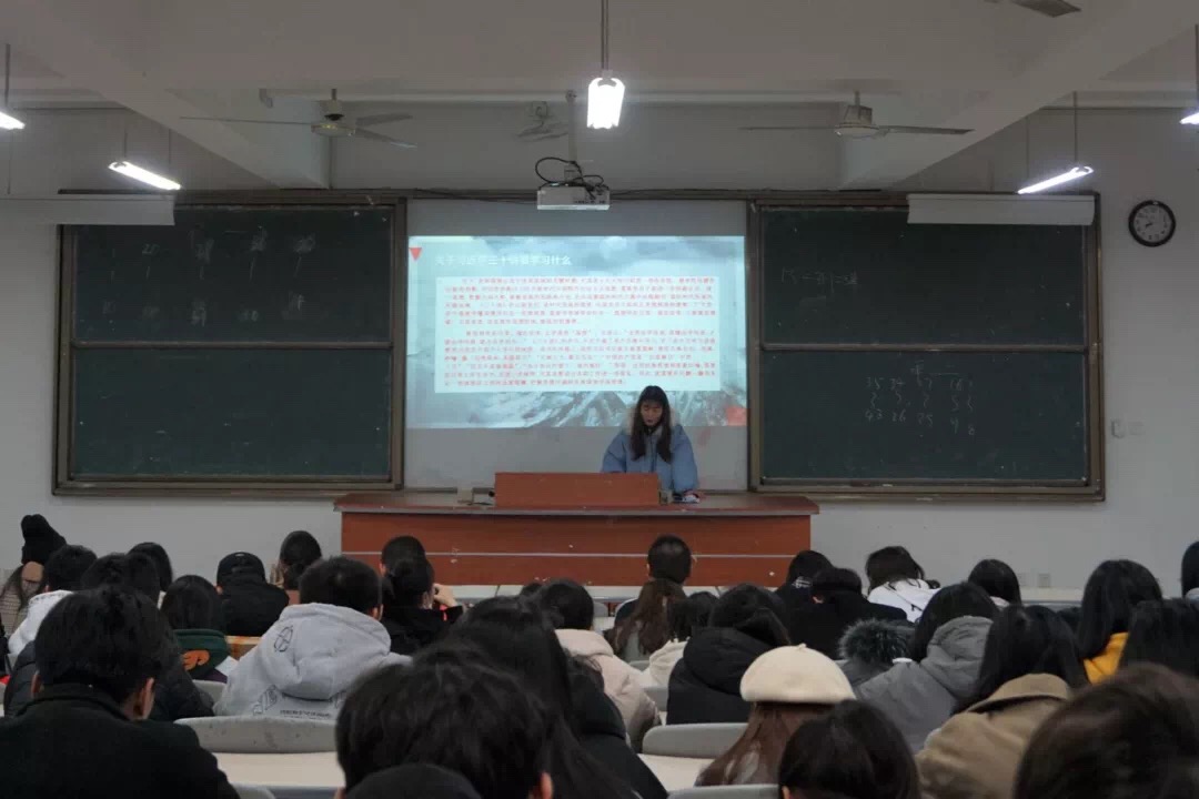 12月28日晚,yl6776永利集团习近平新时代中国特色社会主义思想读书社大学生宣讲小分队于连江校区诚信楼中阶二教室举行本学期第六场宣讲会。本次宣讲会由读书社骨干成员杜炣姌、郭春静两位同学为我校工管系和旅游系近100名同学进行宣讲。