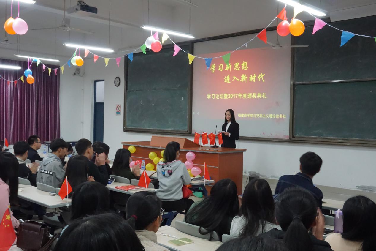 心存祖国富强梦,砥砺奋进伴党行。2017年是读书社扬帆起航的第一年,3月份被评为福建省高校首批重点马克思主义理论读书社;9月份苏金楼同学勇夺我省一“马”当先知识竞赛桂冠;11月份林荟和卢慧敏同学分别获得省“马克思主义能给予我们什么”微演讲比赛一等奖和三等奖。随着学习论坛的智慧碰撞愈发激烈,颁奖典礼也拉开了帷幕,并由马克思主义理论读书社指导老师吕谋琴老师为颁奖典礼致辞。