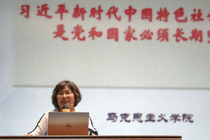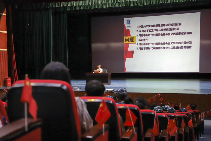成立仪式结束后,林萍教授为在场师生宣讲习近平新时代中国特色社会主义思想,作了题为“习近平新时代中国特色社会主义思想是党和国家必须长期坚持的指导思想”的主题宣讲。她在宣讲中系统阐述了中国共产党指导思想形成和发展的历程,深入浅出地剖析了习近平新时代中国特色社会主义思想形成发展的历史条件、内容体系与历史地位,引导师生全面了解中国特色社会主义进入新时代的历史成就与历史变革、社会主要矛盾的变化和新时代新征程新使命;深刻理解习近平新时代中国特色社会主义思想是马克思主义中国化的新飞跃,是当代中国马克思主义、21世纪马克思主义。