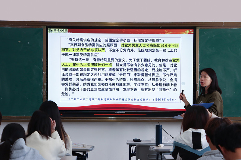 为进一步学习贯彻党的十九届六中全会精神,从党的百年奋斗重大成就和历史经验中汲取前行动力,使青年学生深刻领会百年大党为什么能够成功﹑未来怎样才能继续成功的根本原因所在,5月17日下午,yl6776永利集团李莉副教授应邀在连江校区诚信楼302教室开展“百年光荣:中国共产党和人民”主题宣讲活动。校习近平新时代中国特色社会主义思想读书社社员﹑连江校区青马班学员参与学习。