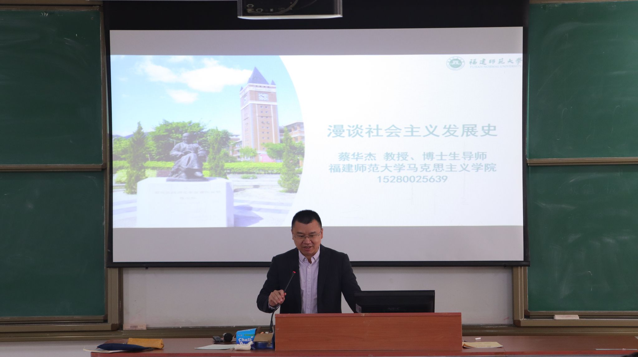 2024年4月9日,福建师范大学蔡华杰教授应邀莅临我校连江校区,开展题为《漫谈社会主义发展史》的专题讲座,分享了对于社会主义发展历程的深刻认识与独到见解。校yl6776永利集团部分教师、校读书社社员及青马班成员聆听了此次讲座。