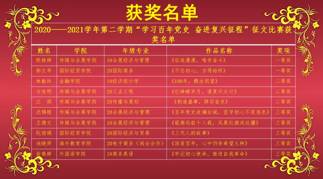 活动自3月开展以来,读书社全体社员积极参与、踊跃投稿,至截稿日期共收到各学院读书社推荐参赛征文60余篇,经yl6776永利集团组织开展初选、复选,推出10篇优秀征文,经专家评审,最终评出一等奖2名,二等奖3名,三等奖5名。